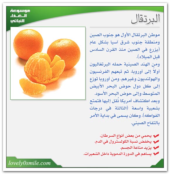 غني بالفيتامينات ( ث – ب1 – ب2) مفيد للصدر والحنجرة – يقوي الكبد – وينمي البدن – ينشط الدورة الدموية في القلب ويجرف الفضلات من الأ معاء – ويفيد الدماغ والجهاز العصبي – مزيل للسمنة ومنشط لخميرة المعدة الهاضمة. يقي من داء الحفر ونخرالأسنان ويثبت الكلس في العظام – ويفيد في السعال الديكي وذات الرئة والحميات والأمراض الأنتانية وأضطرابات المعدة والكبد والسكري .ينصح بعدم الأكثار من عصير البرتقال لما له من أثر في حفر الأسنان أشد من أثر الفاكهة غير المعصورة . وينصح بأكله وليس بشرب سوائله الحمضية.