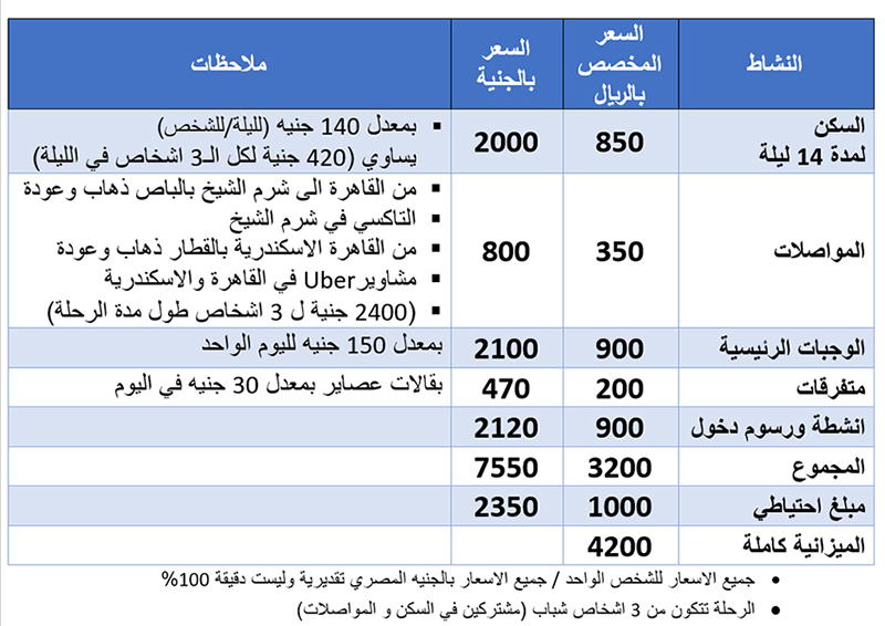 رايكم في هذه الميزانية لرحلة شبابية من اسبوعين