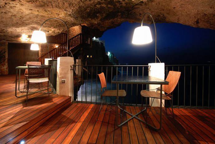 ما وصفته منذ قليل ليس خيالاً؛ ففي بلدة صغيرة جنوب إيطاليا تُدعى Polignano a Mare التابعة لمحافظة باري Bari، التي تتميز بأزقتها الأوروبية الضيقة وبيوتها البيضاء التي تقع كلها على منحدر مطل على البحر، في هذه البلدة واحد من أغرب المطاعم الإيطالية، وهو مطعم Grotta Palazzese التابع لفندق يحمل نفس الإسم.