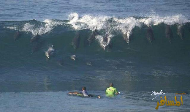 الدلافين تركب الأمواج في خليج جيفري .