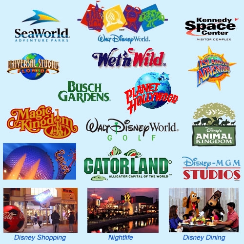 1- Walt Disney World Resortويحتوى على اربعة مواقع وهيEpcot وMagic Kingdom و Animal Kingdom و Hollywood Studios . وهذا المنتجع بمواقعةالأربعة يحتاج لزيارته من يومين إلى أربعة أيام ومن المناسب زيارة موقعين كل يوم .. هذا وانصح اخواني وأخواتي شراء التذاكر من الأماكن الخارجية الخاصة والتي غالباً ما تقع على شارع US 192 او الطريق الدولي International Driveحيث تباع التذاكر في هذه الأماكن بنصف سعرها الرسمي ( 90 دولار للفرد بدلاً من 180-200 دولار) ويمكن معرفة هذه الأماكن من خلال لافتات الأعلان عنها في بالونات كبيرة مضاءة في الليل مكتوب عليها Cheap Tickets . ويجب ملاحظة ان اجور مواقف السياراتلدخول هذا المنتجع 25 دولار في اليوم بالأضافة الى هذه المواقع فإن منتجع Walt Disney يضم ايضا مدينة ألعاب مائية تسمى Typhoon LagoonوكذلكBlizzard Beach ولا انصح بدخولهما لوجود التفسخ الكبير فيهما لإن معظم الألعاب فيهما العاب مائية .