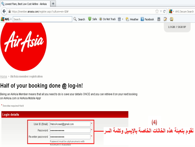 – نقوم بتعبئة الخانات الخاصة بالبريد الإلكتروني وكلمة السر كما هو واضح في الصورة أعلاه عند النقطة رقم (4)