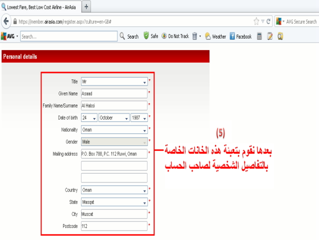 – نقوم بتعبئة الخانات الخاصة بالتفاصيل الشخصية كما هو واضح في الصورة أعلاه عند النقطة رقم (5)