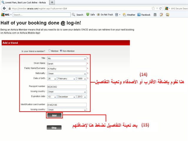 – لإضافة الأقارب أو الأصدقاء إلى قائمتك نختار الخيار كما هو واضح في الصورة أعلاه عند النقطة رقم (12) للتسهيل لك عند الحجز مُستقبلاً