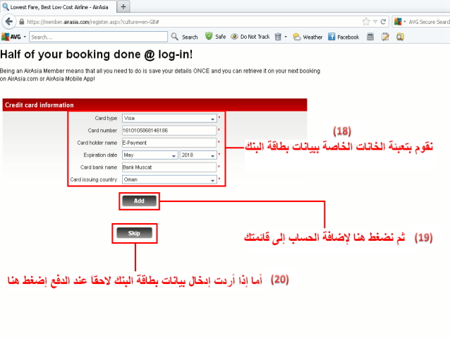 – أما إذا أردت إدخال بيانات بطاقة البنك لاحقاً عند الدفع إضغط على أيقونة التخطي كما هو واضح في الصورة عند النقطة رقم (20)