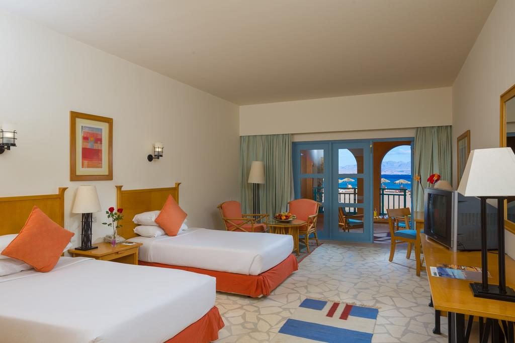غرفة مزدوجة مع حمام سباحة وإطلالة على البحر تضم سريرين فرديين وسرير مزدوج كبير وتتسع لشخصين بالغين وطفل.